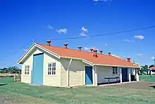The laundry block is a rectangular, timber-framed, building with weatherboard-cladding to above sill height, above which is fibrous-cement sheeting and battening. It has a corrugated iron gabled roof with iron ventilators along the ridge and on the west side of the roof. The building rests on a concrete slab, and has a verandah over a concrete pathway along part of the western side of the building. There is a later, tall metal roller door at the north end of the building, but the remaining doors and fenestration appear to be original. Concrete footings associated with former tank stands are evident on the east side of the building. The building is remarkably intact, and is associated with the earliest phase of the development of the quarantine station at Lytton, in the 1910s. Enclosed laundry yard - the yard area to the east and south of the laundry block has a concrete retaining wall approximately 150 millimetres (5.9 in) high and 150 millimetres (5.9 in) wide. The west and east sides of the yard are bounded by round metal posts capped with concrete while the south side is defined by tram/trolley rails set vertically as posts (1,500 millimetres (59 in) high). There is an open concrete drain along the eastern side of the yard, inside the fence posts. The yard contains 12 square wooden posts approximately 2 metres (6 ft 7 in) in height, which are likely to have supported clothes lines. A service inspection hatch is located centrally in the southern section of the yard. This has a 1 by 1 metre (3 ft 3 in × 3 ft 3 in) concrete housing with a 600 by 600 millimetres (24 in × 24 in) steel lid with embossed cross-hatching and the lettering "Harvey & Son". A block of late 20th century relocatable toilets is also sited in this yard. Despite this, the yard remains substantially intact, and is associated with the earliest phase of the development of the quarantine station at Lytton, in the 1910s.[1]