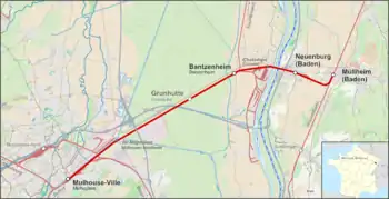 The Müllheim–Mulhouse railway is a 22.140 km-long single-track railway, crossing the Upper Rhine between Baden, Germany and Alsace, France. The whole line is electrified with catenary, using different national electrification standards on either side of the Rhine.[2] It branches off the Rhine Valley Railway (Rheintalbahn) in Müllheim and it connects with the Paris–Mulhouse railway and the Strasbourg–Basel railway in Mulhouse.