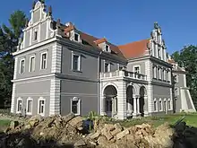 A fortress, probably built around 1400, was rebuilt into the early Baroque castle in 1660. It was modified in 1748 and then rebuilt in the Neo-Renaissance style at the end of the 19th century. Today it is privately owned and inaccessible.[4]