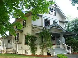 The exterior is of the Craftsman style with horizontal lap siding and a hip roof.[3] There are gables with truss ornaments and dormers in several places, plus a brick endwall on the south side.[3] The building has two porches, and at the time of listing on the NRHP it had leaded, double-hung sash windows.[3] Inside, the style is Arts and Crafts, which includes dark woodwork throughout.[3] The first floor includes a living room, dining room, den, kitchen, foyer, and a small bathroom.[3] The second and third floors consist of seven bedrooms and one bathroom, while the basement is unfinished.[3] There are also a variety of pieces of built-in wood-furniture, such as a bench.[3]