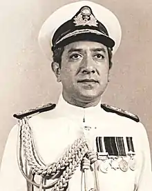 Musharraf Husain Khan (known as M H Khan; 1 February 1932 – 12 October 2018)[1][2] was a Bangladesh Navy Rear Admiral who has served as the chief of the Bangladesh Navy[3] from 7 November 1973 to 3 November 1979. After the Bangladesh war of Independence, Admiral Khan was appointed as the 1st Chief of the Naval Staff of the Bangladesh Navy in November 1973 by the Prime Minister Sheikh Mujibur Rahman. During his tenure, Bangabandhu Sheikh Mujibur Rahman on December 10, 1974 commissioned Bangladesh Navy's largest training base BNS Issa Khan and also handed over “naval ensign” to Bangladesh Navy on the same day. Admiral M. H. Khan joined the Pakistan Navy in 1950. Upon selection as a Cadet into the Pakistan Navy, he was sent to the Royal Navy for training. In 1951 he entered Royal Naval College Dartmouth and after a few years of sea time on RN ships he subsequently, as a Sub Lieutenant was selected to attend the Royal Naval College, Greenwich in 1954. He served on several Royal Naval ships including the aircraft carrier HMS Eagle. He continued his career in the Pakistan Navy and was on a fast track where he achieved the rank of Captain and commanded several of the primary Naval Ships of the Pakistan Navy, including the cruiser PNS Babur and the flag ship destroyer PNS Khaibar. Admiral Khan created the Bangladesh Navy from scratch in very difficult circumstances but was able to create and implement the framework upon which the Bangladesh Navy has been built, following the scope and plan that he laid out in his six plus years as Naval Chief.[4][5]