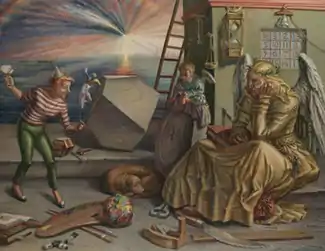 In contemporary scenes, Stanley chronicles romance, friendship, and art-world experiences; Artweek's Cathy Curtis described them as "the art world's answer to Dorothy Parker, Erma Bombeck, and Erica Jong."[54][33] In Sacred and Profane Love (1982) and All That Glitters Is Not Gold (1988),[55] women confront romantic predicaments: fighting to redirect her man's attention from a nearby nude statue, or in the latter, women's fruitless curiosity about men.[50][2] Curator Susan Landauer suggests Stanley's work often carries a "mischievous confessional irony," achieved by inserting an alter ego that reviewers describe as an ideal woman as envisioned by junior-high teen steeped in 1950s daytime television, Archie Comics and Seventeen magazine.[2][29][37] Jupiter and Io (1981) and Pygmaliana (1985) offer sexual fantasies—the alter ego cavorting with lusty gods or spirits sprung to life from mid-air or paintings—while Outside Interference (1988) shows her violently kicking in her television.[49][56][57][2] In other cases, she confronts artistic crises and scenarios: bravely wielding palette and brush to confront her own enormous, Athena-shaped shadow (A Painting of Courage, 1991),[58] solitarily smoking on a bed in Van Gogh's famed bedroom, facing male critics (Judgment of Paris, 2005),[59] or attempting to cheer up Durer’s sad-faced angel in Melancolia (after Dürer) (2012).[33][12][6]
