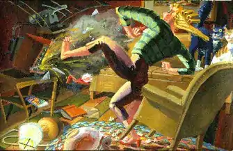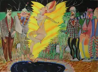 Stanley dubbed the iconoclastic, tongue-in-cheek style of her early work "junior high realism," pointing up its affinity with irreverent notebook-doodle caricature and preference for emotional and observational truth over realism.[26][24][1][39] She painted satires of polite-society formality and American lifestyles, bawdy barroom vignettes, sexually charged domestic scenes and fantastical moments of oddball horror (e.g., Rust's Wedding, 1971).[7][40][41][42] They expressed both private feelings, fears and fantasies and her politicized feminist consciousness—often through powerfully assertive, "brassy" 1930s-1940s-styled women that critics likened to Benton or Reginald Marsh figures, like those in her works The Mystic Muse and the Bums Who Sleep on the Golf Course Behind the Oakland Cemetery (1970) and Barroom Brawl (1977).[22][43]