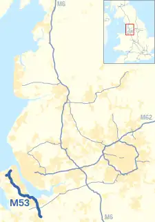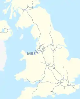 The M53 is an 18.9-mile (30.4 km) motorway in the Metropolitan Borough of Wirral, Merseyside and the borough of Cheshire West and Chester, Cheshire on the Wirral Peninsula in England.[1] It is also referred to as the Mid Wirral Motorway.[2] It runs between the Kingsway Tunnel, at Wallasey in the north, and the A55 at Chester.[1]