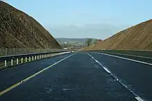 Construction of this 16 km scheme started in December 2007. The section opened to traffic on 25 May 2009, some nine months ahead of the original target completion date.[19] Like the Cashel-Cullahill project, the Fermoy-Mitchelstown scheme was redesignated a motorway during its construction, having originally been envisaged as a HQDC.[20] It was built by Roadbridge Ltd. at a cost of €174 million.[19][21]