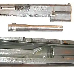 The MAB PA-15 is a delayed blowback operated, semi-automatic pistol. It featured Savage-type, rotating, but not reciprocating, barrel, which has two lugs: one under the chambers is engaged in the frame and allows to the barrel to rotate but not to move back or forward. The other lug (camming lug) is situated on the upper surface of the barrel: it is engaged in an L-shaped cam track in the slide. When the pistol is fired, the rotational inertia of the barrel, the bullet torque and the slide's linear inertia (leveraged through the cam track) all act against the opening force of the cartridge. When the bullet leaves the barrel, internal pressures have dropped and so the action is safe to open: the slide rotates the barrel completely, moves backward, ejects the spent casing and moves forward to pick up a new cartridge, cycling the action. MAB PA-15 has a frame mounted safety, on the left side of the frame, and also internal magazine safety, which does not allow the gun to be fired with magazine removed.