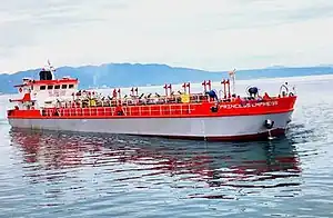 MT Princess Empress, the oil tanker that caused the oil spill, is owned by RDC Reield Marine Services.[8][9] Before it sank, the oil tanker was crewed by 20 people and en route to Iloilo to transport 900,000 liters (240,000 U.S. gal)[lower-alpha 3] of industrial fuel oil from SL Gas Harbor Terminal in Limay, Bataan. According to an energy sector source, industrial fuel oil, also known as "black oil", is "highly toxic to the environment".[10]