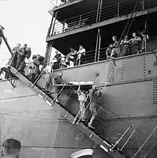 The Hunt-class destroyer HMS Ledbury entered the fire and smoke, rescuing 22 men from Melbourne Star and a few survivors from Waimarama.[15] Nine of Melbourne Star's crew and five of her DEMS gunners were not found.[7] Melbourne Star reached Valletta's Grand Harbour later the same day. Twelve hours after entering port a 6-inch (150 mm) shell from Waimarama's cargo was found embedded in the deck above the captain's day cabin. It had been blown in the air when Waimarama exploded, smashed through the wooden surface of Melbourne Star's deck, embedded itself in the steel plate beneath but failed to explode.[15]