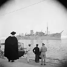 Spectators including a Roman Catholic priest watch Melbourne Star arrive in Valletta's Grand Harbour on 13 August 1942 in Operation Pedestal.