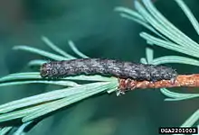 Macaria sexmaculata, known by the common names green larch looper, larch looper or six-spotted angle, is a moth of the family Geometridae. It is found from Alaska to Nunavut and Newfoundland, south in the east to Massachusetts and south in the west to Oregon.
