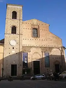 The Cathedral was built in 1459-1464 to designs by Cosimo Morelli; it underwent reconstruction in 1771. The façade and the adjacent square bell tower (1478), which projects forward into the piazza, remain unfinished in brick. The tower's design is attributed to Marino di Marco Cedrino.