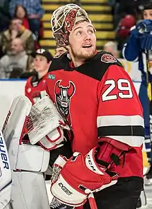 Mackenzie Blackwood (born December 9, 1996) is a Canadian professional ice hockey goaltender for the San Jose Sharks of the National Hockey League (NHL). Blackwood was the top-rated North American goaltender ranked in the NHL Central Scouting Bureau's final rankings for the 2015 NHL Entry Draft.[1] He was selected by the New Jersey Devils in the second round, 42nd overall, in the 2015 NHL Entry Draft.