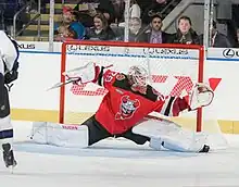 Following his performance in minor hockey, the Colts selected Blackwood in the fifth round of the 2012 OHL Priority Selection.[7] Originally a backup during his rookie 2013–14 season, Blackwood became the Colts' starting goaltender early in the season when Mathias Niederberger left the team and Alex Fotinos struggled in the role.[9] He earned his first shutout on November 1, stopping all 31 shots from the Niagara IceDogs.[10] After leading all rookies in both the OHL and the Canadian Hockey League (CHL) with a 2.98 GAA and .902 save percentage (SV%) and leading OHL rookies with 23 wins, Blackwood was named to the OHL First All-Rookie Team in 2014.[11] Although the Colts' OHL postseason run came to an end with a loss to the North Bay Battalion in the second playoff round, Blackwood was praised by coaches for his performance during the season, and he was expected to remain Barrie's starting goaltender for the remainder of his junior hockey career.[12]