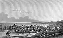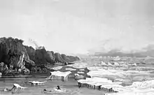 The western detachment quickly faced difficulty at the hands of the Inuit. When the boats became grounded due to the river's shallowness, Franklin, while observing the location's longitude, discovered a nearby Inuit settlement. After instructing Back and the others to be prepared to take up arms should the Inuit prove hostile, Franklin departed for the camp, alongside the party's interpreter, Tattannoeuck (Augustus).[15] The settlement, which contained in excess of 250 individuals, initially greeted the expeditionaries with hesitance.[16] When Franklin later explained the benefit to their people of the putative sea route known as the Northwest Passage, they became friendly. Soon after, however, the Inuit, desiring the party's cargo, plundered Lion and Reliance. After an altercation lasting several hours, Tattannoeuck, who had left the boat for the shore to talk with the Inuit, the tide rose and the two boats departed;[15] Franklin commanded that none of the Inuit follow them under penalty of being shot. He later designated the area where the conflict had occurred as Pillage Point.[17]