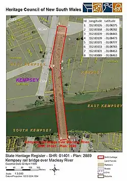 5. 1 2 3 "Kempsey rail bridge over Macleay River". New South Wales State Heritage Register. Department of Planning & Environment. H01041. Retrieved 2 June 2018. Text is licensed by State of New South Wales (Department of Planning and Environment) under CC-BY 4.0 licence.