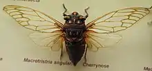 German naturalist Ernst Friedrich Germar described the cherrynose in 1834 as Cicada angularis,[1] reporting its type locality incorrectly as Sierra Leone.[2] Swedish entomologist Carl Stål named the genus Macrotristria in 1870, though this was misspelt as Macrotristia and Macrotistria in some later publications. The cherrynose is the type species of the genus.[3]