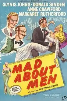 Mad About Men is a 1954 British Technicolor comedy film directed by Ralph Thomas and starring Glynis Johns, Donald Sinden, Anne Crawford and Margaret Rutherford. It was written by Peter Blackmore, who also wrote the 1948 film Miranda which preceded Mad About Men. Johns appears in both films as the mermaid Miranda.[1] However, Rank Films insisted it was not a sequel.[2]