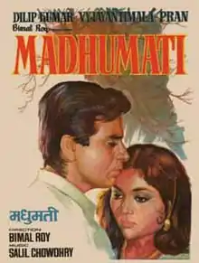Madhumati is a 1958 Indian Hindi-language paranormal romance film directed and produced by Bimal Roy, and written by Ritwik Ghatak and Rajinder Singh Bedi. The film stars Vyjayanthimala and Dilip Kumar in lead roles, with Pran and Johnny Walker in supporting roles. The plot focuses on Anand, a modern man who falls in love with a tribal woman named Madhumati. But they face challenges in their relationship finally leading to a paranormal consequence. The film was ranked 11th in the Outlook Magazine's 25 leading Indian directors' poll for selecting Bollywood's greatest films in 2003.[2]