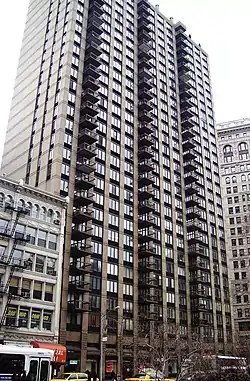 The site was the location of a 5-alarm fire in October 1966 in which 12 firefighters died, the New York City Fire Department's worst loss of life before the September 11, 2001 attacks. The property was owned by the Metropolitan Life Insurance Company, which failed to find a buyer for a decade. In the mid-1970s, when the neighborhood, now known as the Flatiron District, was at its nadir, it was announced that an apartment building would be built on the site, but the building was not actually constructed until 1982, signalling a change in the area's fortunes.[3] The building was designed by Philip Birnbaum, with interior public spaces designed by David Kenneth Spector.[4]