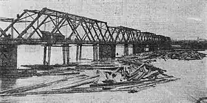 In July 1899, the aging bridge was declared unsafe and in urgent need of rebuilding.[11] Work to replace the structure, on the same piers, began in December 1899, with dismantling of the trusses.[12]
