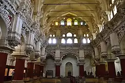 Although temple architecture was the main pursuit of the Nayakas, they constructed other buildings as well. Thirumala Nayaka is famous for his huge Thirumalai Nayakar Mahal, which George Mitchell speculated must have been the largest of all royal residences in the 17th century, develops earlier palace architecture from the Vijayanagara period. This architecture includes both completely indigenous elements such as square and rectangular bases with u-shaped ascending floors with numerous courts and verandahs, as well as double-curved eaves, gopuram-like towers and plastered sculptures as well as elements borrowed from the Bahmanis such as significant presence of arches, cusps, and geometric designs. This Vijayanagara style was blended with indigenous Tamil architecture, for instance, the use of cylindrical columns like Tamil wooden architecture, to create new architectural styles for grand buildings such as the Thirumalai Nayakar Mahal. Only two sections of this palace still stand, the dance hall and audience hall.[18]