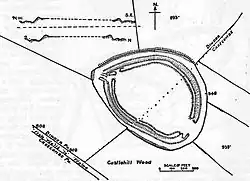 The enclosure has an area of 2.5 hectares (6.2 acres), and lies at a height of 292 m (950 ft),[4] with views in many directions. This includes the Somerset Levels to Glastonbury Tor and Brent Knoll which are the closest and probably the most easily identifiable landmarks from the site. The fort has a single rampart up to 6 m high, with an outer ditch (univallate). Entrances are to the south-east and north-east (with possible outworks).