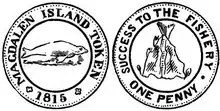 One of the rights claimed by Coffin was the right to coin money, and he ordered the minting of pennies by Edward Thomason of Birmingham, from a design possibly made by the engraver Thomas Halliday, who is known to have worked with Thomason at this time.[6] The obverse of the coin depicts a seal on an ice floe. It is inscribed 'MAGDALEN ISLAND TOKEN' with date '1815' appearing at the bottom. The reverse of the coin depicts a filleted cod and its inscription says 'SUCCESS TO THE FISHERY', followed by the denomination of 'ONE PENNY'. The cod and the inscription on the reverse refers to the fishing industry that was essential to the islands' economy.