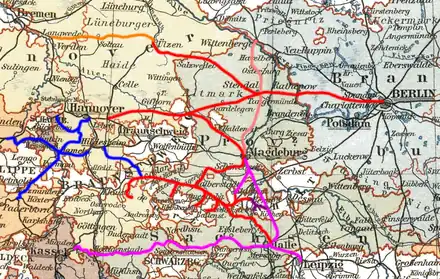 Lines of the Magdeburg-Wittenberge Railway; taken over by the MHE in 1863