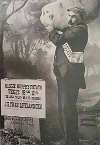 With the help of local photographer Adam Talbot, they produced a photograph which appeared in an 1895 issue of the Loveland Reporter.[1] It was implied the potato weighed 86 pounds 10 ounces, and measured 2 feet 5 inches.[3] Swan swore that he grew it himself.[4] The image quickly spread around the United States. Over one thousand citizens sent letters to Thorndyke, requesting pieces of Maggie Murphy so they could grow their own oversized potato.[2] Requests for seeds were also common.[1] Thorndyke, realizing that the photograph was beginning to get out of control, admitted that it was a hoax. He wrote that he had asked Swan to carve a fake potato out of wood.[4]