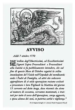 The Venetian Magistrato alla Sanità was the second health provider in Italy to introduce variolation, which had only recently been introduced to Europe from eastern schools of medicine, as a means of inoculation against smallpox, preceded only by the Hospital of Santa Maria degli Innocenti in Florence, and the first to offer it freely to the public for purposes of herd immunity.