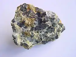 Magnesiohastingsite is a calcium-containing amphibole and a member of the hornblende group.[5] It is an inosilicate (chain silicate) with the formula NaCa2(Mg4Fe3+)(Si6Al2)O22(OH)2[1] and molar mass 864.69 g.[2] In synthetic magnesiohastingsite it appears that iron occurs both as ferrous iron Fe2+ and as ferric iron Fe3+, but the ideal formula features only ferric iron.[9] It was named in 1928 by Marland P. Billings. The name is for its relationship to hastingsite and its magnesium content. Hastingsite was named for the locality in Dungannon Township, Hastings County, Ontario, Canada.[4]