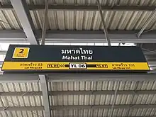 Mahat Thai station (Thai: สถานีมหาดไทย) is a Bangkok MRT station on the Yellow Line. The station is located on Lat Phrao Road, near Soi Lat Phrao 120 in Wang Thonglang District, Bangkok.[1] The station has four entrances.[2] It opened on 12 June 2023 as part of trial operations on the line between Hua Mak and Phawana.[3][4]