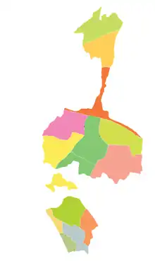 Mahé Municipality with ward boundaries used for the 2006 municipal election. There are 15 wards in total.