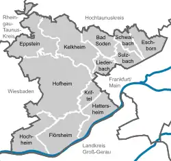 Main-Taunus is a Kreis (district) in the middle of Hessen, Germany and is part of the Frankfurt/Rhine-Main Metropolitan Region as well as the Frankfurt urban area. Neighboring districts are Hochtaunuskreis, district-free Frankfurt, Groß-Gerau, district-free Wiesbaden, Rheingau-Taunus. It is the second most densely populated rural district in Germany.