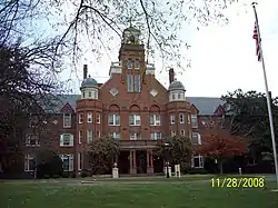 The Main Hall is a historic building located on the campus of Randolph College in Lynchburg, Virginia. It was built between 1891 and 1911, and is a large Queen Anne style brick building complex. The central entrance tower and eastern wings were constructed between 1891 and 1893. Two additional wings were added to the west in 1896. With the erection of a wing to the west in 1899, the building was completed according to the original plan. In 1911 an annex was added to the rear of the entrance pavilion. Further additions and renovations were made to the north elevation in 1936. Its most distinctive features is the central entrance tower with a front portico and topped by a parapet wall and capped by a classically inspired wooden cupola, crowned by a finial.[3]