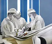 Munsky prepared her works by creating from which she then transferred to canvas with the help of a Slide projector. She was indeed not a photorealist in the usual sense, but oriented herself towards "new reality",[14] applying a "verismo" approach that referenced the 1920s. In her pictures she rearranges the patterns and adapted the overall image by reducing it to essentials and applying a rigidly structured composition. Often her backgrounds use a monochrome presentation so that the viewer will not be distracted from the main subject matter.[5] Her artistic themes revolved around conditions and processes such as pregnancy, birth, surgical operations and death. In pieces such as "Emancipation" and "Twins I and II" she features clinical spaces and medical equipment. She became known through her social-psychological presentations in these subject areas. She impressively "documented" with sober precision the potential for photorealism from the delivery room.