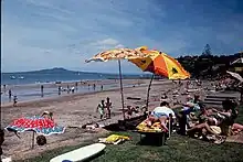 Beachgoers enjoying Mairangi Bay in the 1980s
