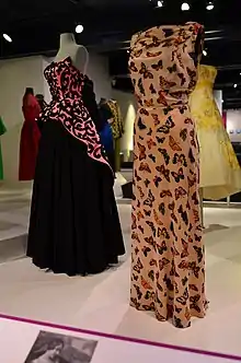 Two Schiaparelli evening gowns. The left gown, from 1951, features Schiaparelli's signature colour, shocking pink. The right gown, featuring a whimsical butterfly print, is from 1937.