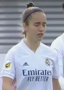 She immediately became a part of Real Madrid's history by being one of the 11 players to start in their first official match in October 2020 (with almost a full team of new signings, they lost 4–0 at home to Barcelona).[12] Two weeks later she was among the scorers in their first victory, and by March 2023 had made her 100th appearance for the Merengues, reaching the milestone in the same match as goalkeeper Misa Rodríguez.[13]