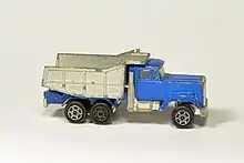 The popular 300 series combinations of cars with trailers and boats as well as semi-articulated trucks dated from the mid-1970s.[2][5] One clever example was the handsome Volkswagen beetle towing kayaks on a trailer, the Renault Michelin canvas topped tractor trailer in blue and yellow from the 1980s, or the Chevy pickup truck hauling a luxurious yacht.[5][6] Buses like the traditional London double decker were also produced in the 300 series in the mid-1980s. These were promotionals advertising the new bus service, but although the labeling was true-to-life, the toy Majorettes decorated bore little resemblance to the real London buses.[7]