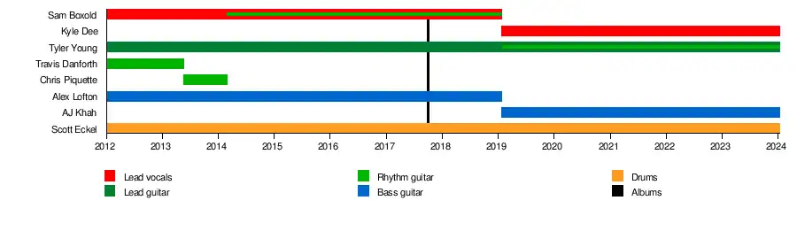 On January 24, 2019, lead singer Sam Boxold announced his departure from the group after their 20/20 tour.[9] In September 2017, MAKEOUT announced that they would be moving forward with the band, with Scott Eckel and Tyler Young remaining, AJ Khah joining as bassist, and Kyle Dee joining as vocalist. MAKEOUT met Khah on Warped Tour years earlier and Young noted that Dee "really nailed the audition" when they were looking for a new vocalist.[6]