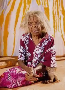 Makinti Napanangka (c. 1930 – 9 January 2011[1]) was a Pintupi-speaking Indigenous Australian artist from Australia's Western Desert region. She was referred to posthumously as Kumentje.[2] The term Kumentje was used instead of her personal name as it is customary among many indigenous communities not to refer to deceased people by their original given names for some time after their deaths.[3] She lived in the communities of Haasts Bluff, Papunya, and later at Kintore, about 50 kilometres (31 mi) north-east of the Lake MacDonald region where she was born, on the border of the Northern Territory and Western Australia.
