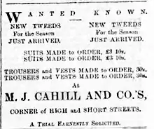 Cahill became a cloths manufacturer and retailer in Ballarat. In 1874 it is recorded that someone tried to pass a fake cheque to his retail business.[3] In 1882 Cahill gave evidence to a Board of Inquiry into the working hours of shop employees.[4] He gave evidence that he had been in business for seven years, he employed 20 hands whose hours of work were 9am to 6pm in winter; 9am to 7pm in summer with the exception of Wednesdays with 2pm close and Saturdays 9am to 10pm. All the drapers in the town had the same working hours.[4] While Cahill and others had tried longer hours, they found that it was better for their businesses to all have the same working hours.[4] All the Sandhurst drapers including Cahill agreed to close on 10pm Saturdays in 1880.[5]