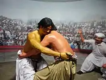Malakhro (Sindhi: ملاکڙو) is an ancient Sindhi form of wrestling in Sindh, which dates back 5000 years.[1] The match begins with both wrestlers tying a twisted cloth around the opponent's waist. Each one then holds onto the opponent's waist cloth and tries to throw him to the ground. Malakhra is one of the favorite sports among males in Sindh, Pakistan. Malakhara matches are generally held on holidays and Fridays and are a feature of all fairs and festivals. Rich feudal lords and influential persons maintain famous Malhoo (wrestlers) and organize matches for them. In the Pakistani region of Sindh, it is the provincial sport.