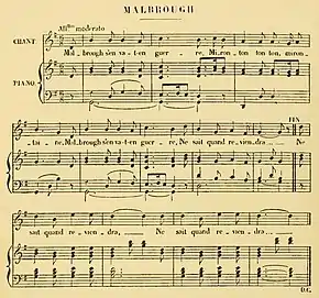For years it was only known traditionally, and does not appear among the many anecdotic songs printed in France during the middle of the 18th century. Beaumarchais used the tune in his 1778 play The Marriage of Figaro for a despairing love song for Cherubino.[1][2] In 1780 it became very popular. For instance, the tune concludes a sonata (in D-major) for viola d'amore and viola composed by Carl Stamitz in 1780 while in Paris. And it happened that when Louis XVII of France was born in 1785 (son of Louis XVI and Marie Antoinette and heir to the French throne) he was wet-nursed by a peasant named Geneviève Poitrine. The nurse, whilst rocking the royal cradle, sang "Marlborough s'en va-t-en guerre". The name, the simplicity of the words, and the melodiousness of the tune, interested the queen, and she frequently sang it. Everybody repeated it after her, including the king. The song was sung in the state apartments of Versailles, in the kitchens and in the stables – it became immensely popular.[3][4]