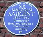 Since 1968, the year after Sargent's death, the Proms have begun on a Friday evening rather than as previously a Saturday, and in memory of Sargent's choral work, a large-scale choral piece is customarily given. Beyond the world of music, a school and a charity were named after him: the Malcolm Sargent Primary School in Stamford and the Malcolm Sargent Cancer Fund for Children.[117] Merging with another charity (Cancer and Leukaemia in Childhood) in 2005, it was renamed CLIC Sargent. In 2021 the charity was renamed again as Young Lives vs Cancer; it is the UK's leading children's cancer charity.[118] In 1980 the Royal Mail put the image of Sargent on its 15p postage stamp in a series portraying British conductors.[n 6] At Albert Hall Mansions, next to the Albert Hall, where Sargent lived, there is a blue plaque placed in his memory.