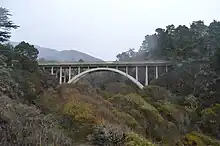 Malpaso Creek Bridge (No. 44-17)[24][25] was built at a cost of $24,000 in 1935 using a reinforced concrete open-spandrel arch design, similar to the famous Bixby Creek Bridge, located 8 miles (13 km) to the south.[26] It is 210 feet (64 m) long and 24 feet (7.3 m) wide.[27]