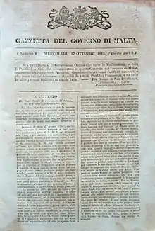 The first edition of the Gazzetta del Governo di Malta was published on 27 October 1813.[6] The first edition entitled Malta Government Gazette in English was published on 7 August 1816.[2] Before freedom of the press was established in 1839, the gazette was the only newspaper published in the islands.[7] From 1930, the gazette began to be published in three languages: English, Maltese and Italian.[2]