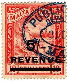 The 1899 stamp was issued solely for postal purposes, and it was duly inscribed "MALTA POSTAGE" at the top. In late 1901, this stamp was overprinted "REVENUE" for use as a revenue stamp, and this overprinted version was issued on Malta in around 1902. In 1908, a special printing of the stamp in red was overprinted and additionally surcharged for use as a 5/- revenue stamp.[3] A change in procedure led to postage stamps becoming valid for fiscal (revenue) use on 1 April 1913, and separate revenue issues were discontinued at this point.[4] The unoverprinted 1899 stamp was therefore used both postally and fiscally after 1913.[3]