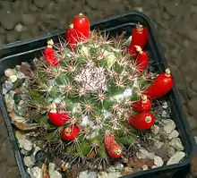 | Mammillaria mammillaris with red club-shaped fruits at the Orto Botanico dell'Università di Genova | |